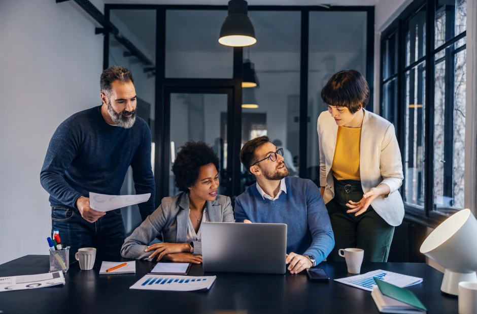 Colleagues discussing in coworking office